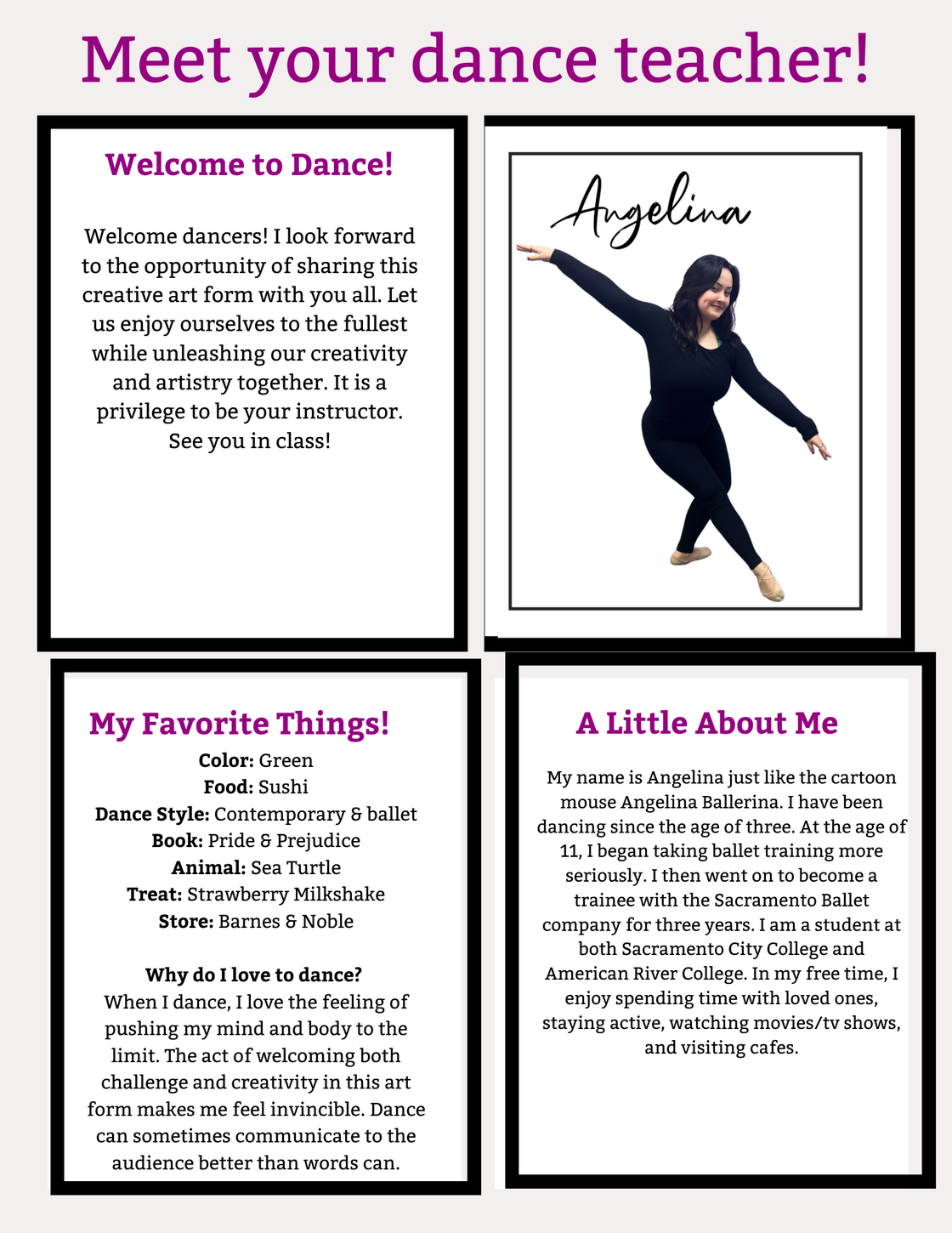Angelina began teaching and choreographing in 2019 at Natomas Charter School: Performing and Fine Arts Academy and at the Sacramento Ballet School. She has experience teaching in a wide range of styles such as classical ballet, contemporary, jazz, and tap. She believes dance is not about reaching perfection. Instead, it is about enjoying oneself to the fullest while unleashing your creativity and artistry.