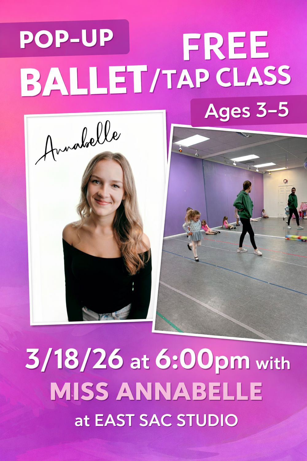 Join us for a special FREE Ballet & Tap Pop-Up Class designed just for dancers ages 3–5! This fun, high-energy class introduces little ones to the joy of movement through basic ballet technique, beginner tap steps, creative movement, and plenty of smiles.