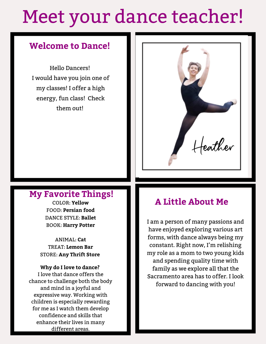 Life has taken Heather on many adventures but dance has always remained woven into everything she's done. As a young adult, Heather performed with the Young Americans and continued choreographing and teaching from the LA and Orange County regions all the way to Indonesia. Upon her return to the Sacramento area in 2013, Heather began teaching here at Fancy Feet where she enjoyed working with all dance levels including the Velocity company. Now, as mother of two beautiful young children, it is an extra special joy to return and share her love of dance in such a loving and positive environment.